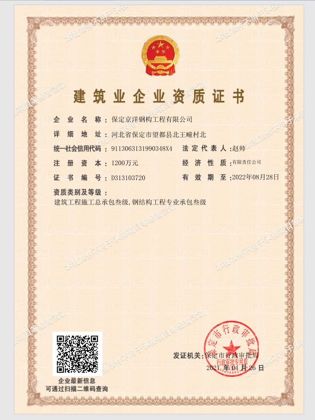 公司主要致力于鋼結構設計、制作、安裝、銷售為一體的鋼結構施工專業企業。成立于2010年,注冊資金1200萬元。公司擁有國內先進的數控自動焊接設備、H鋼結構生產線、CZ鋼快速切換一體機、自動剪切壓板機等,優良的制作加工車間及檢測設備。公司秉承“質量求生存,管理出效益”發展理念,組建了一支高素質、高水平的團隊以及責任明確、職責清楚、獎罰分明的管理體系。